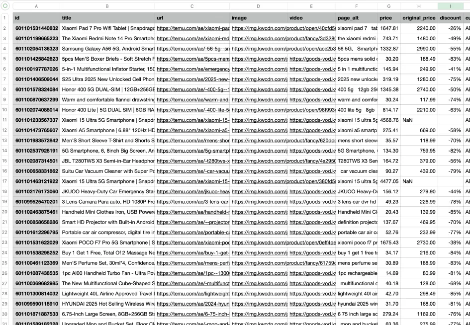 Temu 목록에서 추출된 모든 데이터 필드의 완전한 참조