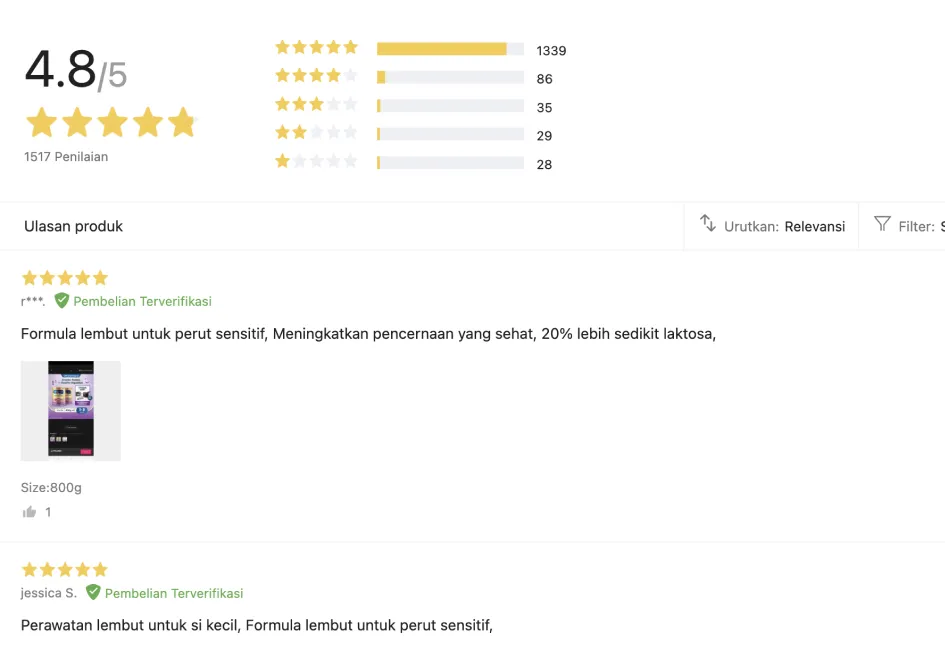 You can sort reviews by: 'Relevant' (Lazada's default), 'Recent' (newest first), 'Rating: High to Low', or 'Rating: Low to High'. This allows you to analyze feedback from multiple angles.
