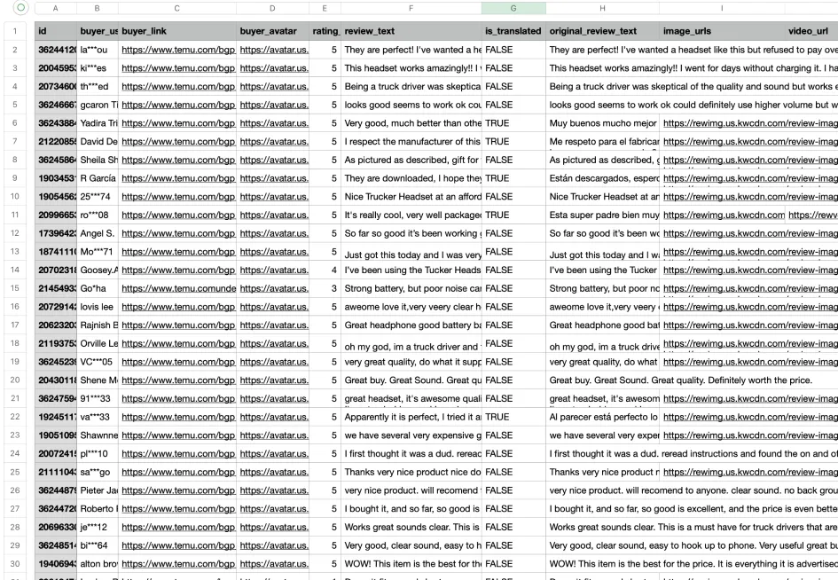 We automatically detect when Temu has translated a review. Our export includes both the translated text you see on the page and the original, untranslated text, giving you the most authentic feedback.