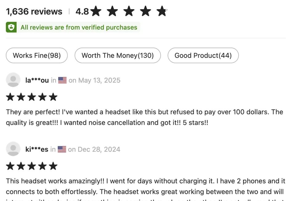 Our scraper is designed to extract the data points that matter most for research: customer photos/videos, detailed product specs, 'buy again' sentiment, and even reviewer profile links for deeper analysis.